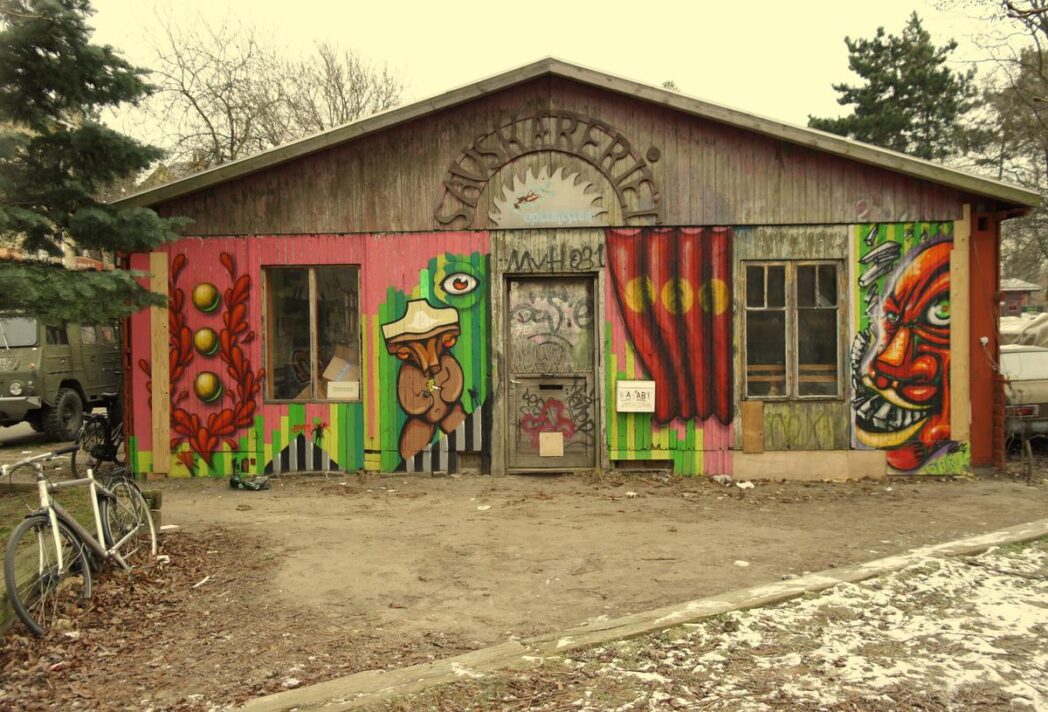 Je však na Kodani ještě něco, co přitahuje chladuvzdorné turisty? Je to něco, co neznalému oku na první pohled přijde jako smetiště. Kusy starého železa vzájemně se proplétající a pohlcované korozí, stavby připomínající bunkry, které jsme si jako děti stavěli na sídlištích, oprýskaná omítka o kus dál, chuligánsky počmárané zdi, vrak auta, jemuž zpod kapoty vyrůstá podezřelá květena.